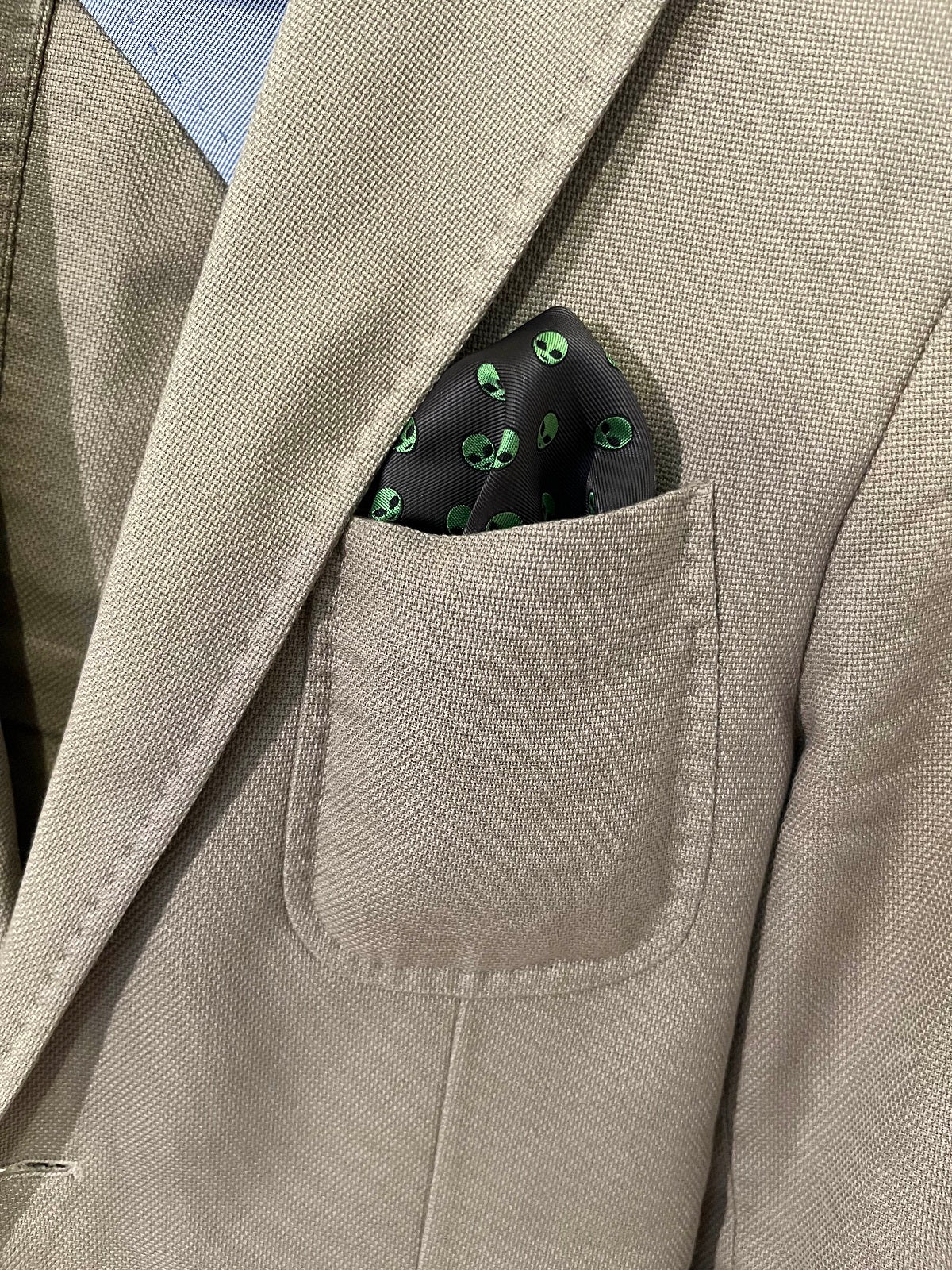 A bold and intriguing pocket square that brings extraterrestrial mystery to your wardrobe. Featuring captivating alien motifs, this design is perfect for those who believe in the unknown and embrace intergalactic wonders. Add a touch of cosmic curiosity to your outfit with this statement piece.